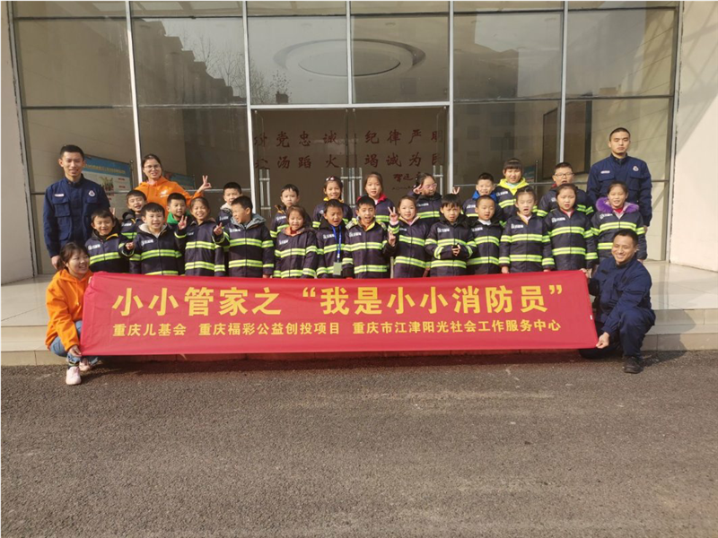 6重庆市江津阳光社会工作服务中心承办的小小管家项目在德感消防队开展了我是小小消防员活动