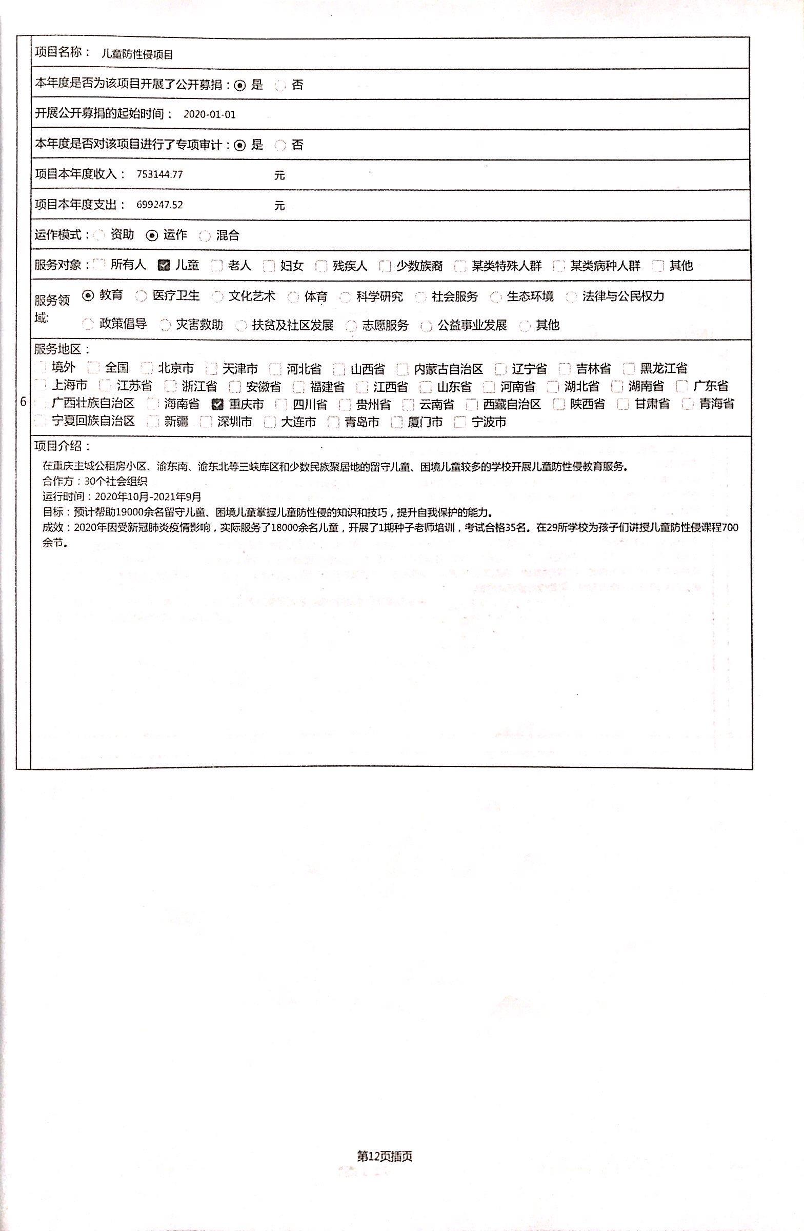 儿童防性侵项目2021年度在重庆主城、渝东南、渝东北等三峡库区和少数民族聚居地的留守儿童、困境儿童较多的学校开展儿童防性侵教育服务,帮助15000余名儿童掌握儿童防性侵知识和技巧,提升自我保护的能力。收支情况见下图