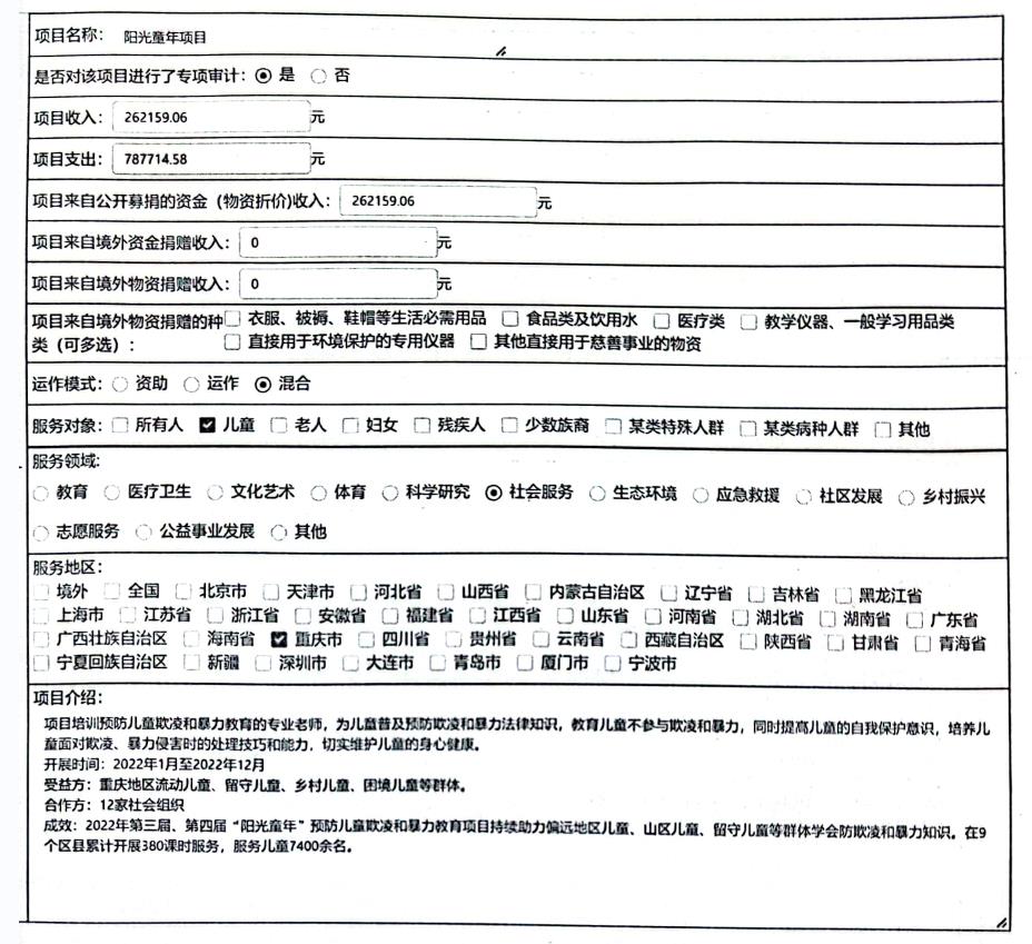 阳光童年项目在本年度联合了12家重庆地区的公益慈善社会组织共同开展第三届、第四届“阳光童年”预防儿童欺凌和暴力项目。该项目在9个区县累计开展380课时服务,服务儿童7400余名,普及了预防欺凌和暴力知识,提升了儿童自我保护意识,掌握了面对欺凌和暴力侵害的处理能力,减少我市儿童欺凌和暴力现象的发生。收支情况见下图