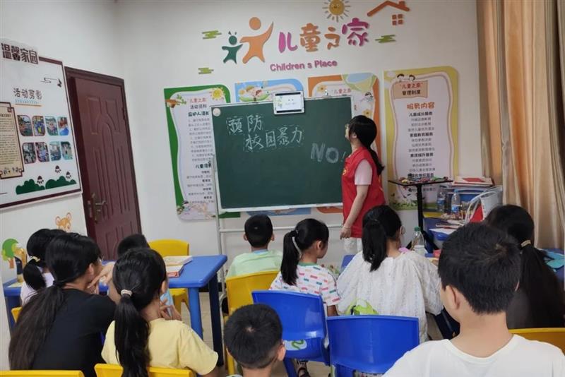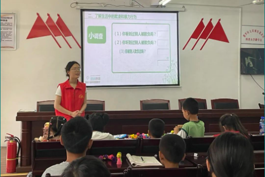 7月,阳光童年防欺凌——防霸凌安全知识教育课堂走进社区青少年之家 志愿者老师带领孩子们了解校园欺凌行为,辨认校园欺凌和小霸王行为,教导孩子们如果遇到要立即告诉老师、家长,减少伤害。课堂上志愿者老师还引导孩子们表达自己对校园欺凌的看法与理解,学习如何去预防和面对校园欺凌,还通过演习表演增加课堂趣味性。