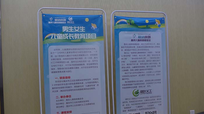 2016年12月12日,由重庆儿童救助基金会主办,重庆市江北区绿叶义工志愿者协会机构承办实施的“男生女生”儿童成长教育项目挂牌仪式在重庆市江北区鸿恩实验学校进行。学校校长和书记对项目进行了高度的评价,认为对现在的小学生开展这样的课程非常的有必要。两位校领导表示会积极配合和支持课程在学校的展开,并且感谢儿基会为鸿恩实验学校的孩子带来了这样对成长有益处的课程。