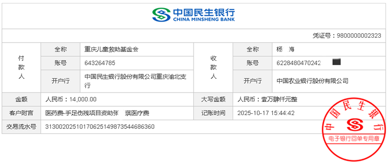 开户单位:重庆儿童救助基金会 | 开户银行:中国银行重庆江北支行 银行账号:1088 1466 9913