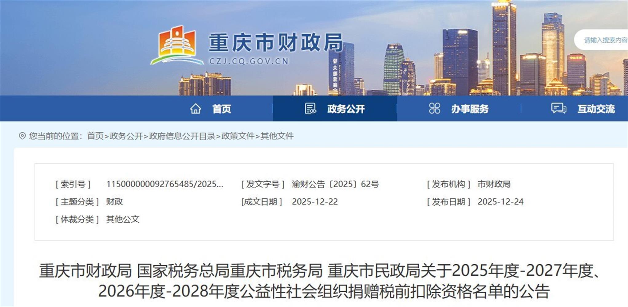 重庆市财政局 国家税务总局重庆市税务局 重庆市民政局关于2025年度-2027年度、2026年度-2028年度公益性社会...