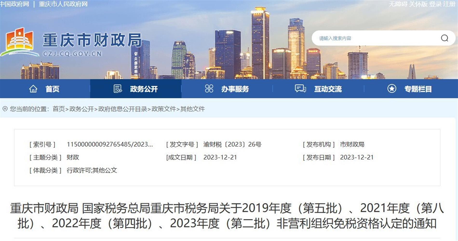 重庆市财政局 国家税务总局重庆市税务局关于2019年度(第五批)、2021年度(第八批)、2022年度(第四批)、2023年度(第二批)非营利组织免税资格认定的通知渝财税〔2023